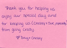 “Thank you for helping us enjoy our special day and for keeping us (Chelsey & Sue, especially) from going crazy.”